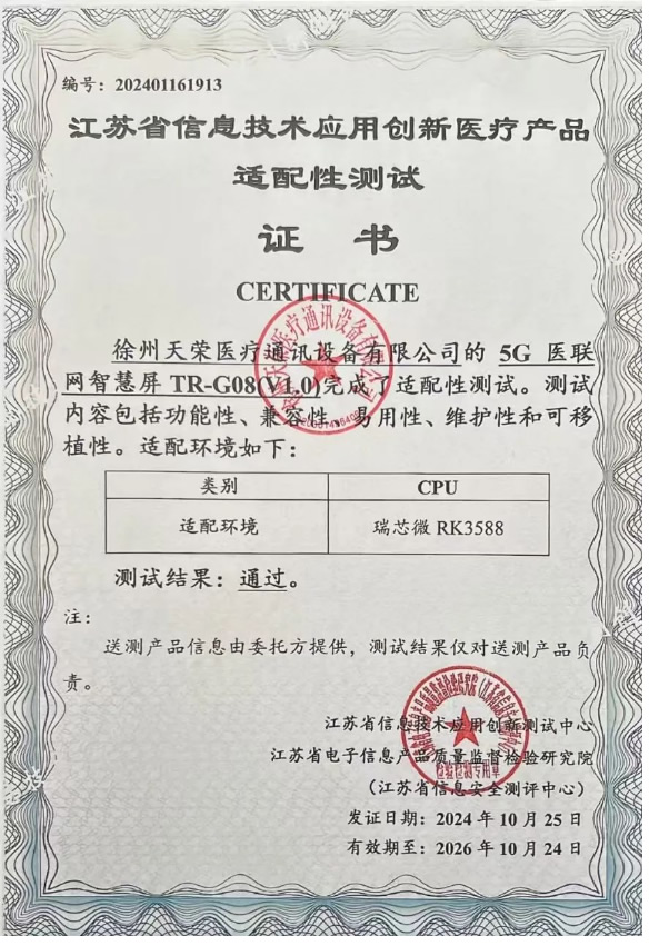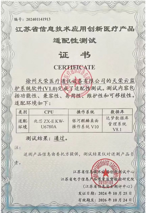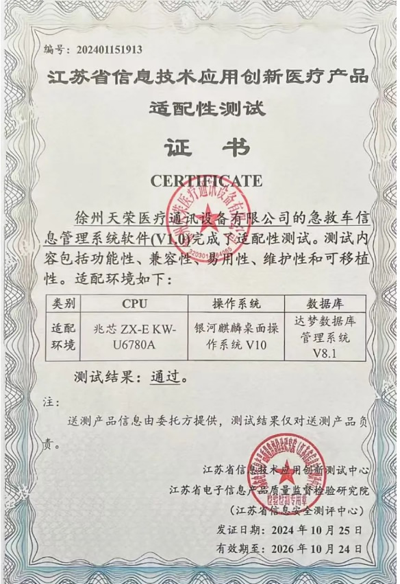 智慧急救云/5G智慧型救护车天荣医疗智慧医疗三款核心产品通过“江苏省信息技术应用创新医疗产品”检测认证