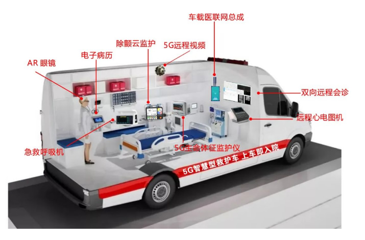 5G智慧急救车集成了:车载医联网总成 、除颤云监护 、5G远程视频 电子病历、 AR 眼镜 、双向远程会诊、 远程心电图机、 急救呼吸机 、5G生命体征监测仪等。