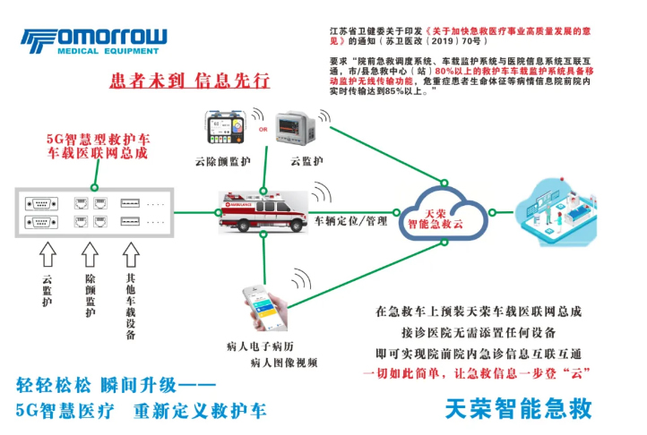 在车辆出厂前预装天荣车载医联网总成(含面板)一步打造真正意义5G时代智慧型救护车,实现伤病员生命体征等医疗急救信息的远程传输,做到急救信息院前院内无缝衔接,患者未到信息先行。